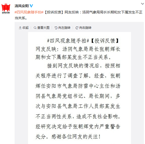 河南省安阳市纪委监察局今日通过其官方微博通报,近日有网友反映,河南省安阳市汤阴县气象局局长张朝辉长期和女下属郝某发生不正当关系。经查,张朝辉多次与郝某发生不正当两性关系,经研究决定给予张朝辉严重党内警告。