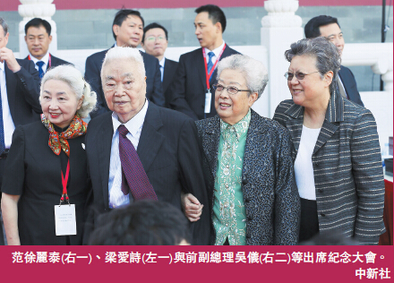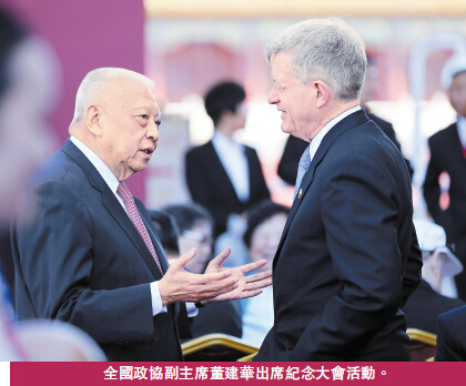昨天上午10時,紀念活動開始,在70響禮炮聲中,國旗護衛隊護衛著五星紅旗從人民英雄紀念碑行進至廣場旗桿處,舉行升旗儀式,全場高唱國歌。在天安門前觀禮臺的香港代表、著名華僑領袖徐四民之女徐新英注視著國旗濕潤了眼睛。她對記者說,站在天安門下,看著國旗冉冉升起,自己特別感觸。「在中國紀念抗戰勝利60周年的時候,我的父親來北京參加了紀念活動,獲頒了紀念章,他當時非常激動。十年過去,如果父親還健在,看到國家的發展,一定也會深深的感動。」
