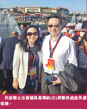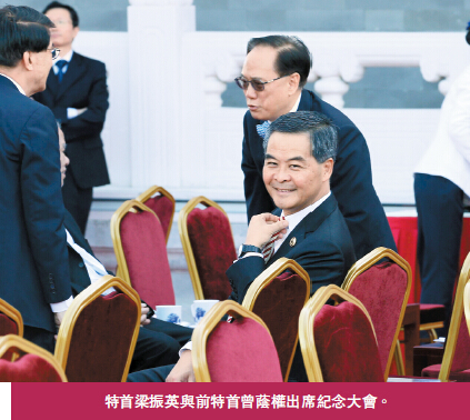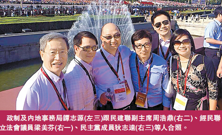 湯家驊亦對閱兵感到雀躍,拍下不少照片,包括現場照片;他亦與譚志源、梁美芬等人合照,氣氛融洽。香港商報記者 戴合聲