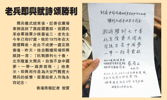 在現場觀禮的港區政協委員陳清霞對記者提到了自己的父親--東江縱隊的老戰士,這位曾為香港抗日戰爭作出諸多貢獻的老人,也曾在20年前來北京參加抗戰紀念50周年的活動。「我聽父輩說過許多抗戰的艱苦往事,明白和平來之不易,此次也有十余位香港老戰士來北京出席閱兵式,看到他們的眼神就明白,如果我父親還在世,也會對國家深感光榮。」