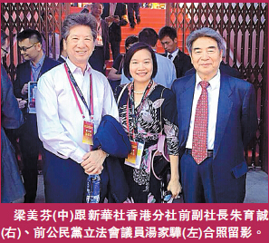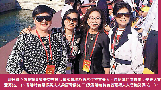 梁美芬又曬出與眾多老朋友的合照,包括新華社香港分社前副社長朱育誠、前公民黨立法會議員湯家驊、民主黨成員狄志遠;她形容:「難得一齊出席這樣有紀念價值的閱兵活動,一齊拍照留念。」