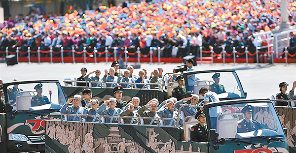 平均年齡90歲的抗戰老兵、平均年齡88歲的抗戰支前模范、平均年齡78歲的英烈子女作為抗戰先烈的代表組成的2個乘車方隊,行進在受閱方隊最前面,接受了一個國家的敬意。