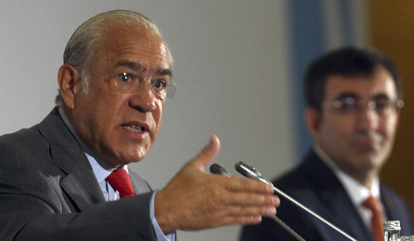 9月5日,经合组织秘书长安赫尔·古里亚(左)在G20会议期间的记者会上讲话。新华社/美联
