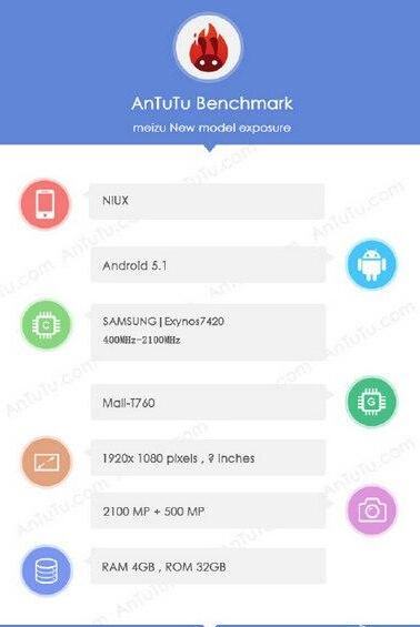 此外,安兔兔還在微博中表示,大家關心的(魅族)新機2K屏,目前數據庫中沒有相關信息,似乎在暗示魅族NIUX無論高配還是低配版所配觸控屏都支持的是1080p分辨率。因此,魅族NIUX的基本配置將是5.5英寸1080p分辨率觸控屏,三星Exynos7420處理器,低配3GB RAM/高配4GB RAM,搭載Anrdroid 5.1系統,配有500萬像素前置鏡頭和2100萬像素主攝像頭。