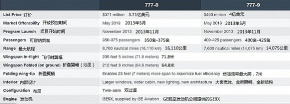 777X的相關參數,頂級配置的777X將花費4億美元。
