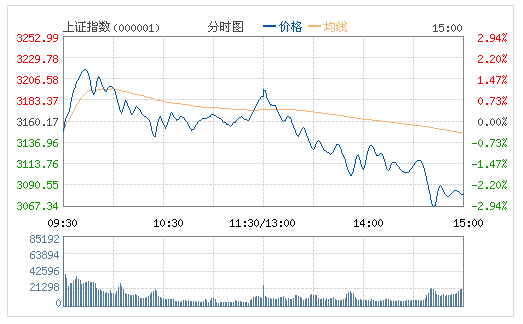 內地股市今日早盤窄幅震蕩,權重股低迷,題材股活躍,午后國企改革等板塊領銜跳水,帶動大盤下行,截至收盤,滬指跌2.52%,報3080.42點。