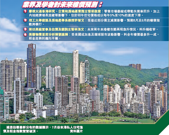 不過,亦有業界人士對后市持樂觀態度。其中,美聯物業首席分析師劉嘉輝認為,雖然7月樓價升勢開始反映股市波動的影響,惟市場對細單位需求仍大,故相信下半年細價樓升幅繼續跑贏豪宅,全年樓價亦可保持最多一成的升幅,至於租金方面,則預期會趨向平穩發展。此外,萊坊高級董事及估價及諮詢主管林浩文認為,未來兩年的樓市難再現急升的情況,并預計升幅將收窄,但相信仍會出現單位數的升幅。