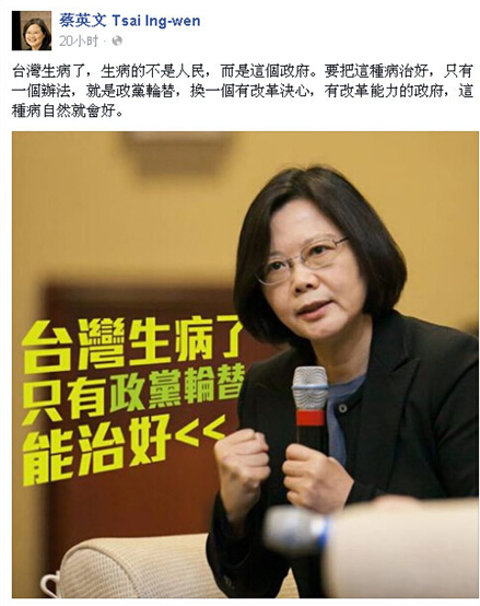 6日下午走訪彰化時,蔡英文講得更加明確,她認為生病的不是人民,而是現在的執政黨和政府,要把這種病治好,只有一個方法,就是政黨輪替。