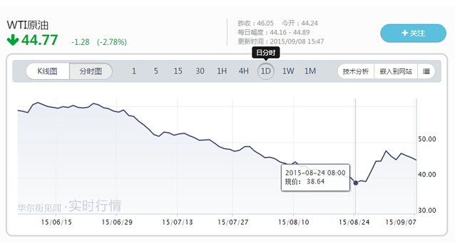 華爾街見聞此前提及,上月底WTI油價跌破40美元關口,最低觸及每桶38.64美元,創2009年以來新低。布倫特原油也跌至每桶43.31美元。