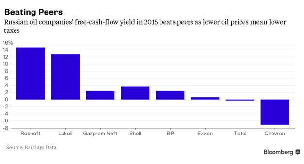 據巴克萊數據,稅收和貨幣貶值所帶來的利益,令俄羅斯Rosneft和Lukoil生產現金流的速度達到殼牌和BP的兩倍。