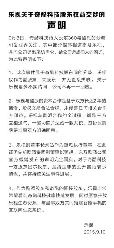 9月10日下午2點,樂視控股在官方微博中發表聲明,正式回應近期因“插足”360酷派導致合作生變一事。樂視稱,樂視入股酷派,交易合法,這次奇酷股東之間的分歧,與集團并無直接關系。