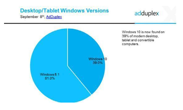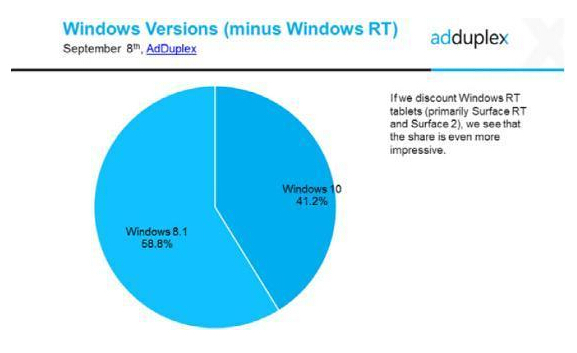 這些數據也包括運行Windows RT的設備,它們不具備升級到Windows 10的路徑。AdDuplex表示除去Windows RT的數據之后,數據顯示Windows 10具有更大的41.2%的份額,而Windows 8.1占58.8%。