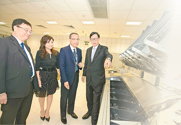 香港銀行同業結算有限公司(結算公司)有關人士示範支票清分。圖為金管局總裁陳德霖(右一),金管局助理總裁(金融基建)李建英(左一)及香港銀行同業結算有限公司行政總裁鄧月容女士。