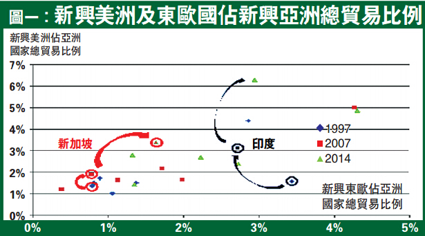 先看圖一,亞洲新興國與新興東歐及美洲地區的貿易來往。由1997年亞洲金融風暴開始,經歷2007年金融海嘯至今,亞洲七大新興國與東歐及美洲的貿易關系都未見顯著改善。譬如新加坡,1997年東歐與新興美洲占新加坡總貿易分別為0.8%至1.4%,但到2014年底只上升至1.6%至3.8%,幅度上或說得過去,但實際數字仍然處於極低水平。就算數到較鄰近東歐的印度,十多年間與東歐貿易的占比更錄得跌幅,由1997年的3.4%跌至2014年的2.9%,同樣情况亦發生在其他亞洲新興地區上。由此可見,在環球新興國占亞洲新興國的貿易占比仍處於極低水平下,就算亞洲出現經濟下滑,以貿易渠道傳染到其他新興市場的機會仍然很微。