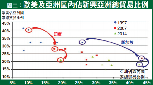 話說回來,雖然坊間常說新興市場經濟如何強勁及如何充當世界經濟火車頭,但要論對全球經濟的影響性,在單是美國及歐盟地區已占超過全球GDP一半的情况下,要看時下金融或經濟危機會不會於全球大規模爆發,亦要看看新興亞洲與先進歐美的貿易關系。圖二見到,1997年至今,歐美占新興亞洲貿易的重要性持續降低,而亞洲區內貿易關系卻愈來愈密切。以印度為例,1997年歐美占印度總貿易約四成,但截至2014年已經下跌至兩成左右,同時其他新興亞洲占其總貿易額則由低於一成上升至兩成,類似升幅亦見諸在其他亞洲地區上。
