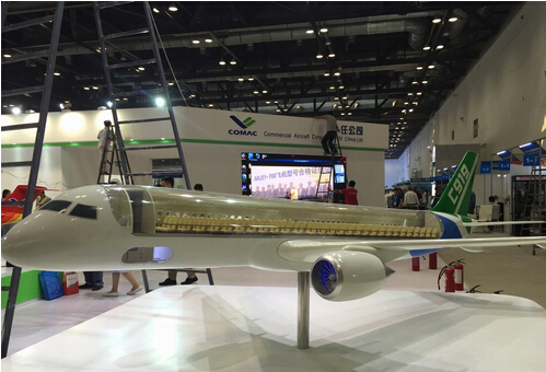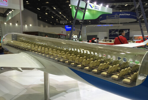 【環球軍事/航空報道】2015年9月16日至19日,第16屆北京國際航空展在國家會議中心舉辦。記者在航天開幕前期探館,帶來北京航展的精彩畫面。在中國商飛的展臺,以模型形式展出了國產C919大飛機以及ARJ-21新支線飛機,飛機模型一側都是采用透明材料制作,可以看到飛機艙內設施布置情況。從畫面中可以看到,C919大飛機可以安裝168個乘客座位(每排6個,共28排)。