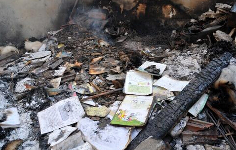 2015年9月16日,山東平邑,在死者張紀民家被燒毀的房屋內,女兒的課本散落在地。 新華社
