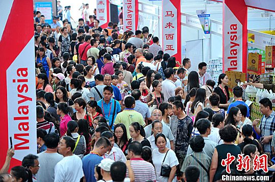 主會場南寧國際會展中心人氣爆棚,民眾紛紛進館掃貨,搶購異國商品。胡雁 攝