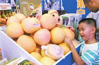 9月20日,第5屆中國-東盟優質水果推介展銷活動在南寧舉行,象州縣三紅蜜柚是來賓唯一展出產品。該柚具有皮紅、膜紅、肉紅的特點,引來一撥又一撥客人詢問、購買。圖為一位小朋友在好奇地撫摸三紅蜜柚。(黃隆天 攝)