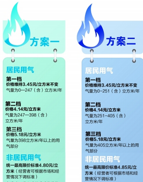 會上公布了兩套價格改革方案(見左圖)。綜合來看,以各方案第一檔氣價計算,居民用氣價格每立方米維持不變。