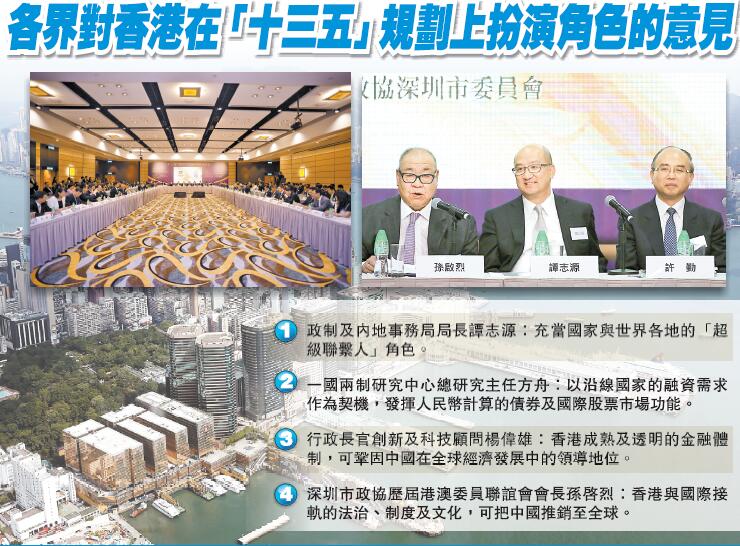 其中,政制及內地事務局局長譚志源在會上指出,參考了「十二五」規劃的經驗,政府已就金融、旅游、文化、科技及環保等方面向中國發改委提出建議,冀望特區未來可繼續發揮特區「一國兩制」的優勢,充當國家與世界各地的「超級聯繫人」角色。他又指,過去本港已與深圳、澳門兩地建立出官方合作平臺,并在環保工作合作上取得一定成果,日后除會繼續深化三方的經濟和社會民生合作外,亦會與發改委保持溝通,積極配合「十三五」規劃的工作,把握國家「一帶一路」戰略帶來的機遇,進一步提升本港的競爭力。