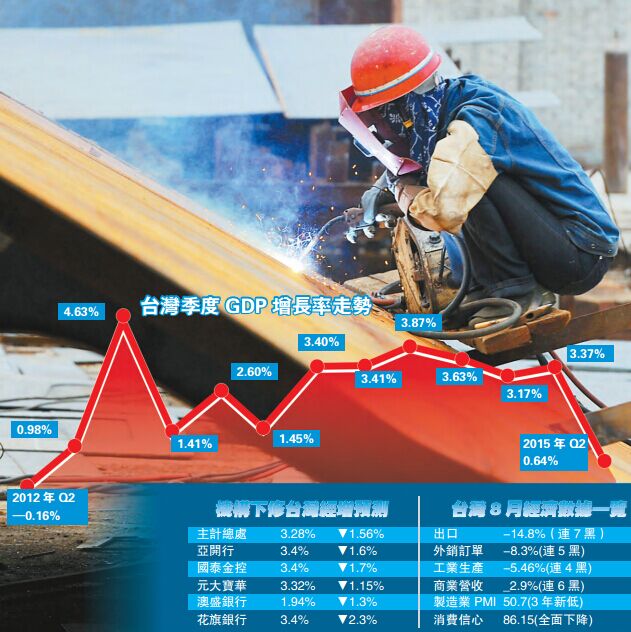 元大寶華綜經院預期,臺灣下修2015年經濟增長率至1.15%,調降幅度多達2.17個百分點。其中,對於第三四季的增長率預測分別為-0.35%、0.79%,顯示第三季出現衰退已是不爭事實,即便是進入第四季旺季,恐怕也無法回覆強勁增長。