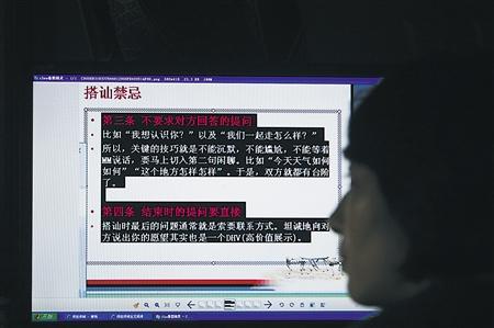 “22日晚上這節課也很精彩,老師居然教我們如何表白、搭訕。”田婷稱,在課堂上,胡老師總結了“搭訕注意事項”:想認識,不能從背后拍人肩膀;不要由上往下打量對方的全身;不可要電話、QQ,直接掏出手機加微信;網上聊天,不要以“在嗎”開場……