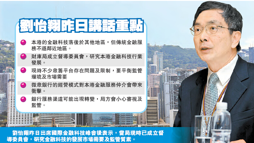 劉怡翔指,本港的金融科技落后其他地區,是由於香港地方較細,網上銀行的服務需求亦相對較少,但財庫局已成立督導委員會,會尋找穩健的架構,以保障投資者為先,研究發展金融科技的框架。