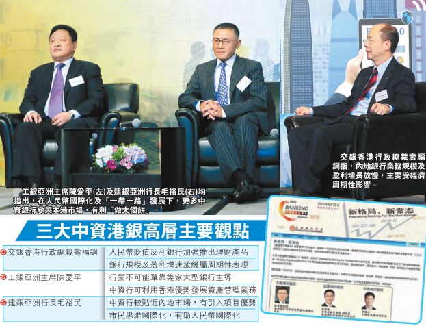 談及香港銀行業未來發展,毛裕民指出,商業銀行主要靠規模取勝,而目前豐(005)及渣打(2888)等大型外資行在香港規模明顯有優勢;如建銀亞洲等中資行卻較貼近內地市場,有望帶頭將人民幣國際化及「一帶一路」的機遇帶到香港,與其他本地銀行合作分享成果,即是「會把蛋糕弄得更大」。