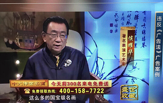 利用知名艺人侯耀华等人员进行涉嫌虚假宣传,提升自身产品影响力。经工商部门调查核实,所谓的“传世名画”只是浙江某工艺品厂生产的丝绸制印刷品。其行为误导消费者并进行虚假宣传。