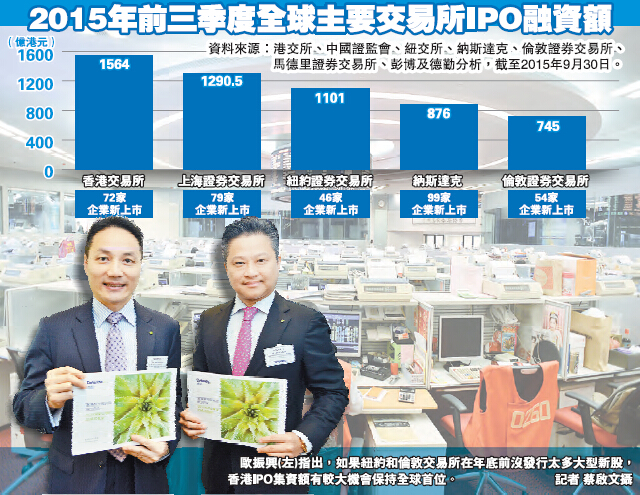 【香港商報網訊】記者莊海源報道:德勤表示,以集資額計算,香港交易所今年首三季IPO冠絕全球。德勤中國全國上市業務組聯席領導合夥人歐振興指出,如果紐約和倫敦交易所在年底前沒發行太多大型新股,香港IPO集資額有較大機會保持全球首位。香港今年頭三季將錄得72隻新股集資1564億元,較去年同期減少13%新股上市和多募集19%資金,內地企業仍是香港IPO的關鍵主力。其中,排名前五的新股均為H股,占香港市場集資總額超過三分之二。