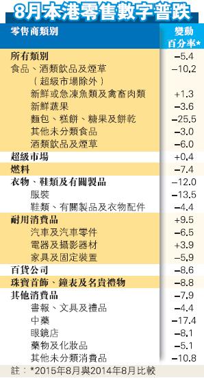 亦有部分零售業銷貨價值上升,如超級市場貨品銷貨價值微升0.4%,電器及攝影器材升3.9%。雖然其他未分類耐用消費品大升50.2%,但升幅較7月時進一步縮窄。