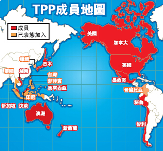 這個由12個國家和地區組成的巨無霸,顧名思義涵蓋了太平洋兩岸,包括北美洲的美國、加拿大,拉丁美洲的墨西哥、智利、秘魯,東北亞和東南亞的日本、新加坡、越南、馬來西亞、汶萊,以及大洋洲的澳洲和新西蘭;除此以外,過去表達了加盟意願的國家和地區,還包括韓國、印尼、泰國、菲律賓、台灣、哥倫比亞等,如無意外相信在不久將來都會獲准加入(詳見附圖)。