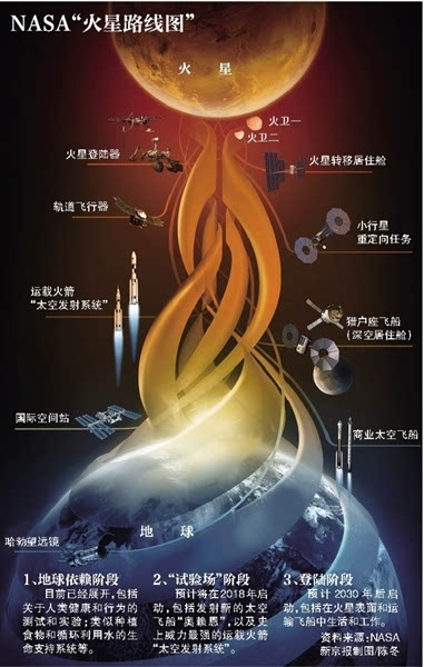 在這份名為《美國航天局的火星之旅:開拓太空探索下一步》的報告中,美國航天局將人類登陸火星計劃分為“三步走”。報告沒有設定登陸火星的具體日期,但美國航天局局長查爾斯·博爾登在聲明中說,美國“比歷史上任何時候都接近將美國宇航員送上火星”。