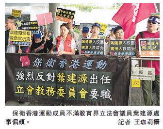 【香港商報网訊】記者王珈莉報道:立法會教育事務委員會將於今日選出新一年度的正、副主席。保衛香港運動約20名成員,昨早手持標語及橫額,由金鐘港鐵站游行至立法會示威區,沿途高叫口號,強烈反對教育界立法會議員葉建源在委員會改選后擔任主席或副主席。團體批評葉建源於去年的「占領行動」中,在校園煽動學生參與違法行為;加上早前在港大任命副校長事件中處事偏頗,認為他無法持平地處理香港整體教育發展,公正主持會議。