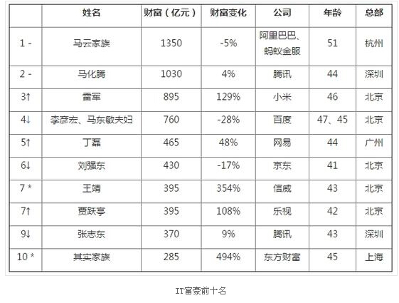 自2003年第一張胡潤IT富豪榜發布以來,有5位IT富豪連續十三年上榜:馬雲十三年來財富增長540倍,李彥宏增長190倍,馬化騰增長147倍,王文京增長44倍,丁磊增長6倍。