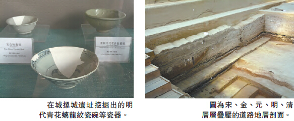 「所以,開封不光是城摞城,還是路摞路,城門摞城門。」從遺址上亦可發現,當時的道路修建甚為講究,道路運輸量大,道路旁邊還有排水溝。遺址的剖面分層可以清楚地看到清朝早期、明朝、元朝和宋朝幾個朝代的路面情況。據介紹,宋朝建都100多年,在這期間道路不斷修補,再加高,但其路面全部用黃土鋪成,夯得非常堅實,工作人員介紹說,「這三層路面已有上千年的歷史,但依然保存得非常結實,用今天的鐵鎬往下砸的話,只能砸一個小坑。」
