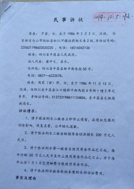 芦菲状告平昌县人民政府和文物局副局长的起诉状。