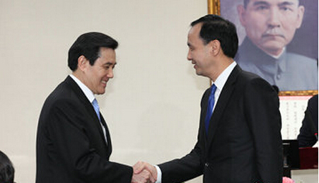 資料圖:國民黨前主席馬英九(左)與新當選的黨主席朱立倫(右)握手致意。
