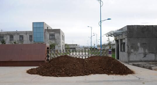 圖為廠區門口已被沙土堵路。 記者 張遠 攝