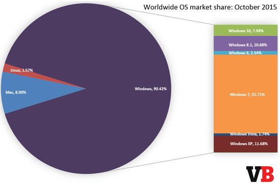 Windows Vista的份額上升0.01%,至1.74%,而Windows XP的份額下降0.53%,至11.68%。Windows 10的免費升級并不適用于Vista和XP。但微軟仍希望,Windows XP的市場份額在今年內降低至個位數。2014年4月,Windows XP已不再獲得技術支出,而企業用戶正對此做出反應。