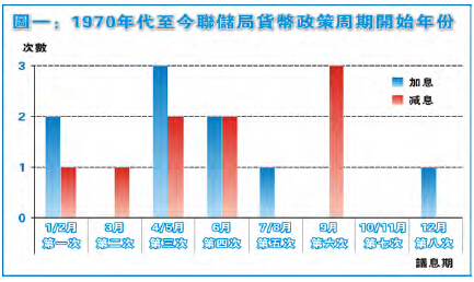 第二,其實12月加息的可能性有多高呢?筆者主要計算每個加息周期的第一次加息日,因為市場每每視加息周期開始為大件事。1970年至今,大大小小共有六個加息周期(起碼維持一年的加息期才計算在內)。首先,一年開8次例會,當中有4次是在月底或翌月月初,其中有8個月合併為4組。圖一見到,在這50多年間,6次加息周期中只有一次是自12月開始,其餘大都集中在第二季。同樣地,再看看減息,在一共8次的減息周期中,聯儲局甚至未曾在12月開始過。總括來說,上半年開始加息的機會是大大高於下半年的。另外,若以1994年後聯儲局正式以議息會議來宣布貨幣政策為起點計(1994年前未有議息會議),當中有5次加或減息(周期開始)是集中在6月至9月,兩次在1月底及2月初。由此可見,聯儲局推行新一輪貨幣政策是絕少會在年底動手的。