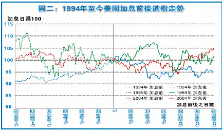 論12月加息的機會率,估計耶倫又會看看到時市況的表現才作決定。然而,其實歷史亦多見,就算股市弱勢,聯儲局都會決定開始加息周期。圖二見到,由1990年代至今,1999年與2004年便演繹壞消息盡出的道理。以1999年為例,美國加息前半年道指持續向下,高低位計曾跌十多個百分點,但當時聯儲局都決定在1999年6月30日加息。奇怪的事情發生了,加息後道指反而回穩。而2004年亦見類似情況。由此可見,何解耶倫要瞻前顧後呢?市場想法是耶倫不能預測的。如果耶倫真的那麼「好炒」,何不轉行做交易員?應對經濟好壞做實事,才是為官之道。