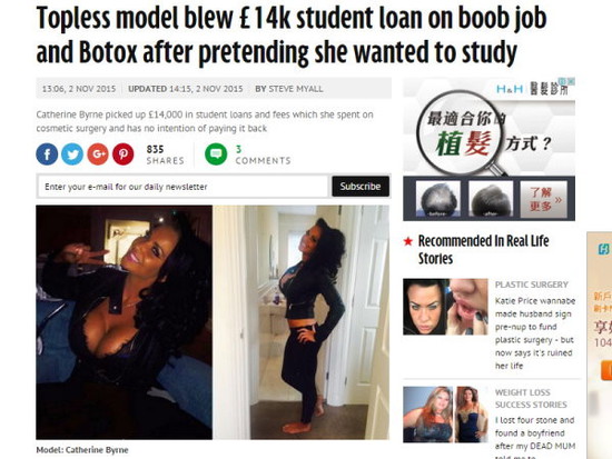 根據英國《鏡報》(The Mirror)報導,這名現年29歲的女模凱瑟琳(Catherine Byrne),日前向友人大剌剌地吹噓自己,當初如何是透過就學貸款來進行隆乳和整形。她自爆22歲時申請進入東倫敦大學(University of East London)心理系,但自己無心向學,竟把申請到的7000英鎊學貸拿來隆乳,從B罩杯升級到D罩杯,并還打了肉毒桿菌和膠原蛋白。