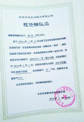 出于對銀行工作人員的信任,加之在其極力游說下,張女士毫不猶豫地與劉某簽訂了投資協議。就這樣,200萬元在銀行當場就轉入了中金鼎鴻合作伙伴北京金博潤投資中心的賬戶。雙方約定,從2014年1月6日開始計息,年利率為11%,每半年分紅一次,投資期限為1年。