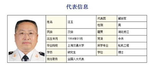 澎湃新闻记者从中国人大网查询发现,全国人大代表汪玉属于解放军代表团,出生于1964年1月,籍贯为湖北枝江,毕业于上海交通大学,所学专业为轮机工程,拥有博士学位。