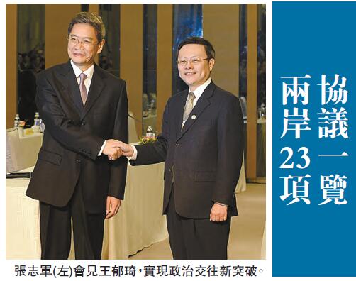 在兩岸協商方面,2008年6月,恢復中斷了9年的制度性協商,海協會和海基會迄今已舉行11次會談,簽署23項協議,包括醫療、交通、司法、經貿等,猶如為兩岸人民往來提供了23條高速公路,共同營造了65年來最佳的兩岸關系。另外,兩岸協商已從半官方的白手套(海基會與海協會)時代,2014年實現兩岸事務主管部門負責人常態化會晤并互訪,而即將登場的「習馬會」則將兩岸對話層級提至最高層次,兩岸將實現高層直接對話。