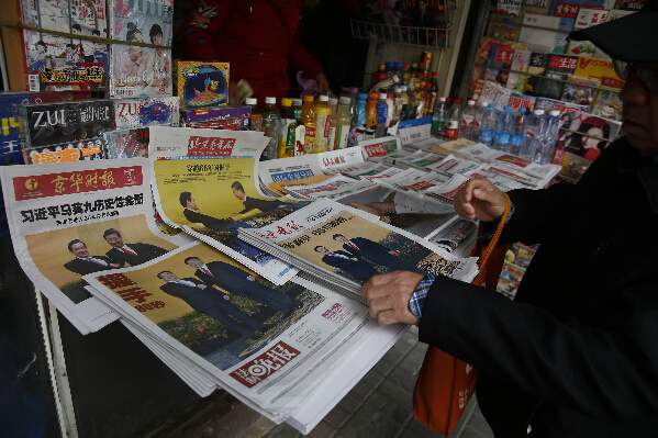 8日,北京市民在报摊选购当日报纸,从早报到晚报,北京各大报纸头版都是有关“习马会”的消息。 中新社