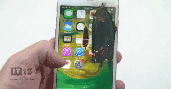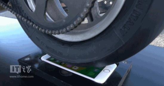 這次TechRax想出來的方法是將iPhone6s放在摩托車的車輪下,然後開足馬力讓告訴旋轉的車輪和iPhone6s屏幕表面進行摩擦。在這樣高速旋轉摩擦產生的熱量下,iPhone6s的屏幕理所當然的被燒壞了,車輪抬起來後可以看到手機表面明顯在冒煙。不過好在iPhone6s的屏幕還沒與完全壞掉,沒有被摩擦的地方依舊能夠正常工作。