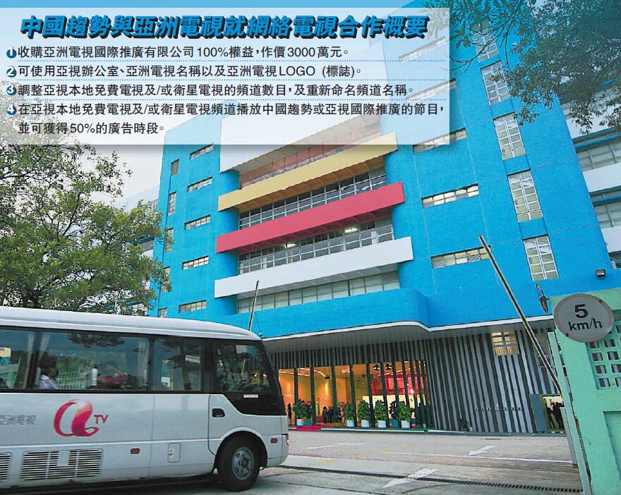 據交易公告指,中國趨勢將收購亞洲電視旗下亞洲電視國際推廣100%(下稱「亞視推廣」股權,作價3000萬元。雙方將共同在互相聯網電視,包括固定終端及移動終端領域上合作,公司將向亞視推廣注入節目內容、播放系統、接收終端及配套服務的資產。